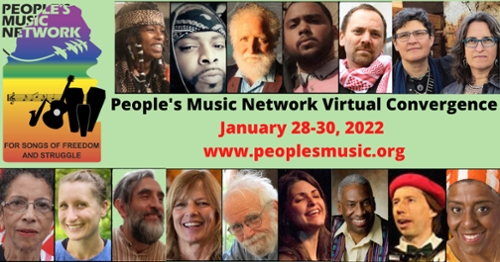 The Winter Convergence of the People's Music Network for Songs of Freedom and Struggle -- January 28-30, 2022 -- connects and mobilizes performing artists and activists all over the world who use music, poetry, and other art forms as catalysts for justice and peace. It includes an opening concert, multiple skills workshops, presentations, and participatory song circles. It takes place in a series of Zoom Rooms, led by experienced facilitators. Attendees may also sign up for a performance slot in the Round Robin, and reconnect with others during the built-in social times. Find more info and register here!