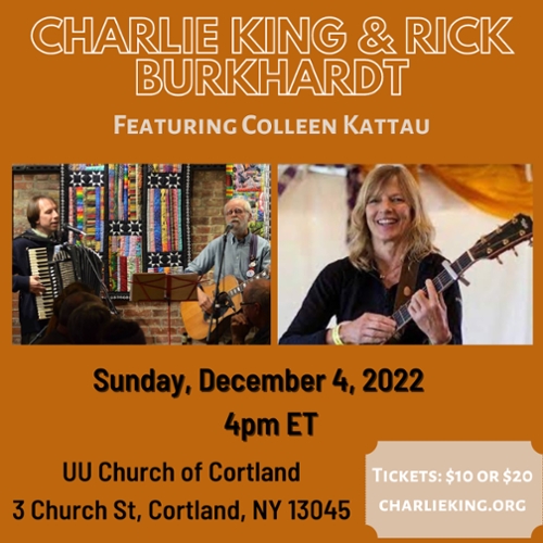 Use the link to buy a ticket to the livestream of the show featuring Charlie King, Rick Burkhardt, and Colleen Kattau in Cortland, NY! We look forward to having you join us virtually if you can't make it in person to this show! If you can make it in person, click here for information on the in-person show.